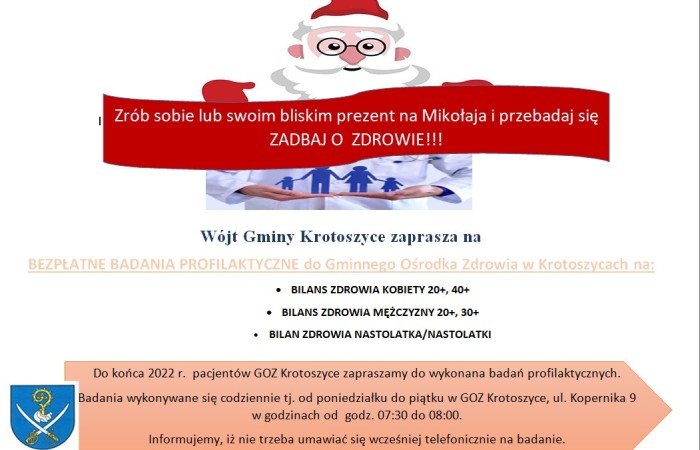 Wójt Gminy Krotoszyce zaprasza na BEZPŁATNE BADANIA PROFILAKTYCZNE do Gminnego Ośrodka Zdrowia w Krotoszycach.