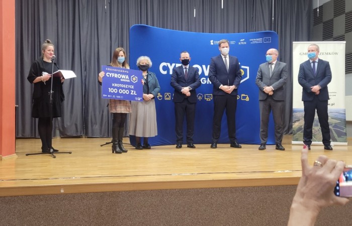 W dniu 29 listopada 2021 r. w Ośrodku Kultury w Przemkowie odbyło się spotkanie z Ministrem Januszem Cieszyńskim- sekretarzem stanu ds. cyfryzacji w Kancelarii Prezesa Rady Ministrów, które poświęcone było programowi „Cyfrowa Gmina”.Gminę Krotoszyce reprezentowała Pani Barbara Kałuża-Boczula – Zastępca Wójta, która z rąk Ministra odebrała czek z kwotą dofinansowania 100 000,00 zł.