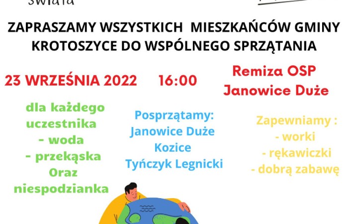 Zapraszamy na "Sprzątanie Świata", które odbędzie się w dniu 23 września 2022 r. Start przy Remizie OSP Janowice Duże, godzina 16:00