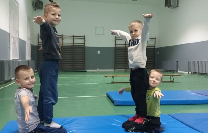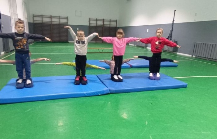 W ramach prowadzonych zajęć dzieci z oddziału przedszkolnego w grupie 6-6 - latków uczestniczą w zajęciach z gimnastyki akrobatycznej, które usprawniają je ruchowo. Celem zajęć jest także budowanie silnych kości i mięśni.