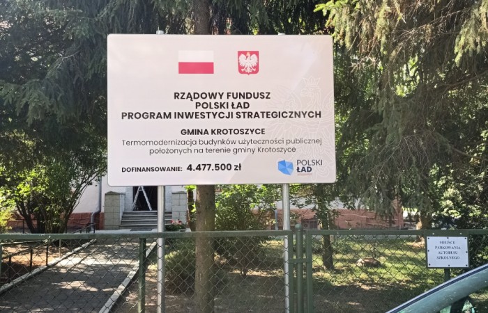 W ramach podpisanej umowy wykonywane są prace termomodernizacyjne na następujących obiektach: budynek użyteczności publicznej położny w Krotoszycach przy ul. Kopernika 9, budynek Szkoły Podstawowej im. H. Sienkiewicza w Kościelcu, budynek sali gimnastycznej w Krotoszycach. Celem prowadzonej inwestycji jest poprawa jakości powietrza poprzez redukcję emisji CO2, poprawę efektywności energetycznej budynków oraz poprawę warunków nauczania oraz obsługi petentów, zwiększenie wykorzystania odnawialnych źródeł energii poprzez zastosowanie jednej instalacji fotowoltaicznej na budynku szkoły w Kościelcu oraz poprawę atrakcyjności osadniczej gminy Krotoszyce dla obecnych i przyszłych mieszkańców. Całkowita wartość robót wynosi: 7 967 581,18 zł, w tym dofinansowanie z RPO WD w kwocie 2 633 679,61 zł i dotyczy on obiektów szkolnych, dofinansowanie ze środków Polski Ład w kwocie 4 477 500 zł