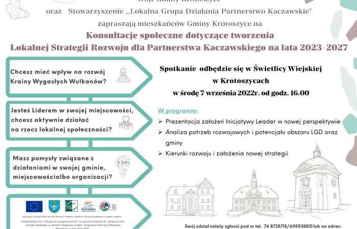 Pan Wójt Gminy Krotoszyce Wojciech Woźniak oraz Zarząd Stowarzyszenia ,,Lokalna Grupa Działania Partnerstwo Kaczawskie" zapraszają mieszkańców Gminy Krotoszyce na Konsultacje społeczne dotyczące tworzenia Lokalnej Strategii Rozwoju dla Partnerstwa Kaczawskiego na lata 2023-2027.