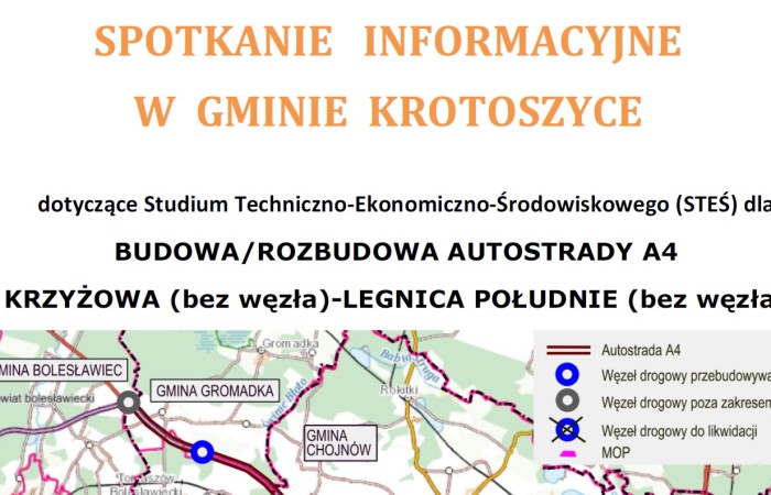 Wójt Gminy Krotoszyce informuję, iż w dniu 16 marca 2022 r. o godz. 16:00 odbędzie się spotkanie w formule on-lnie ws rozbudowy autostrady A4