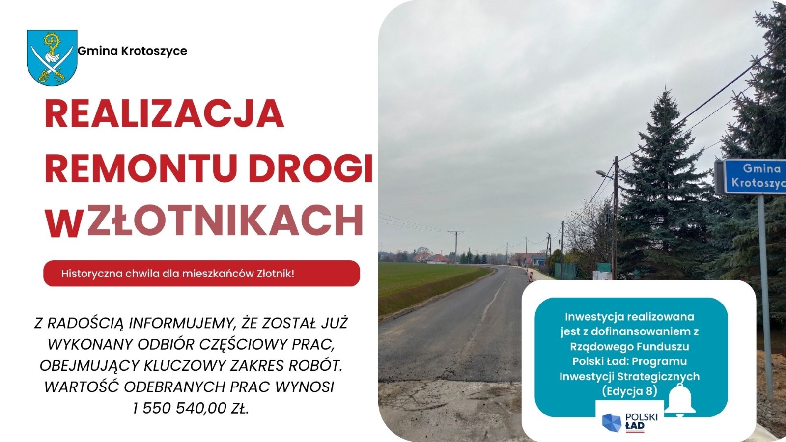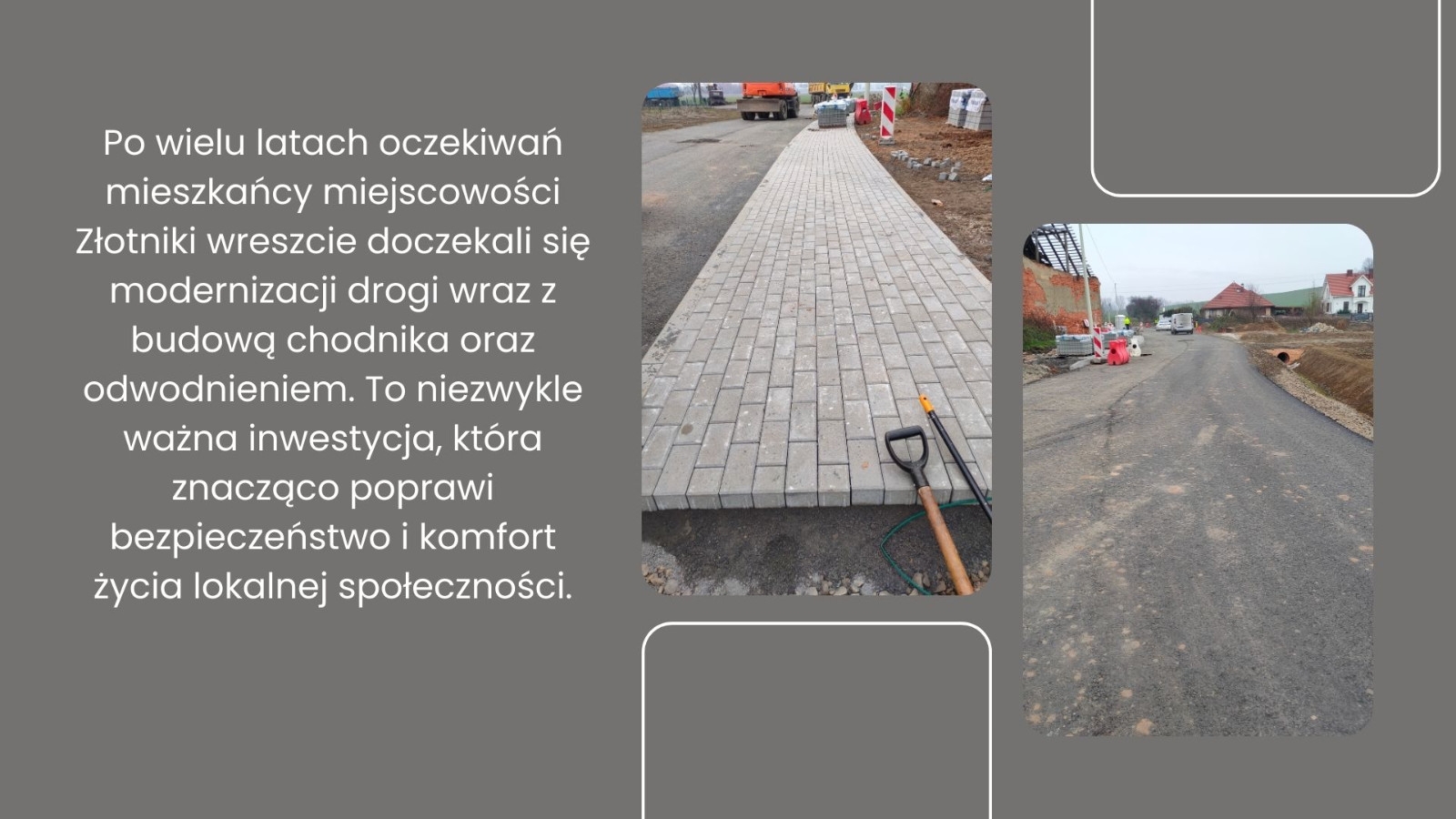 Po wielu latach oczekiwań mieszkańcy miejscowości Złotniki wreszcie doczekali się modernizacji drogi wraz z budową chodnika oraz odwodnieniem. To niezwykle ważna inwestycja, która znacząco poprawi bezpieczeństwo i komfort życia lokalnej społeczności.