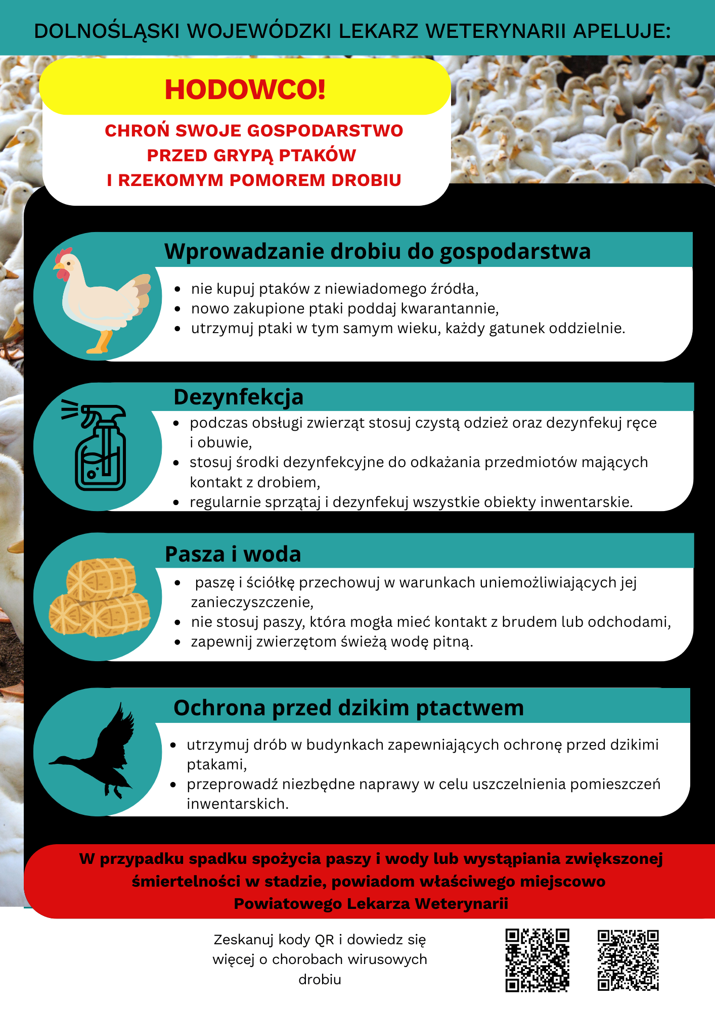 W związku z narastającą, wyjątkowo niekorzystną sytuację epizootyczną, obejmującą liczne ogniska grypy ptaków (HPAI) oraz rzekomego pomoru drobiu (ND) na terenie kraju, Powiatowy Lekarz Weterynarii w Legnicy prosi o przekazanie właścicielom drobiu komunikatu dotyczącego zagrożenia ze strony w/w chorób.