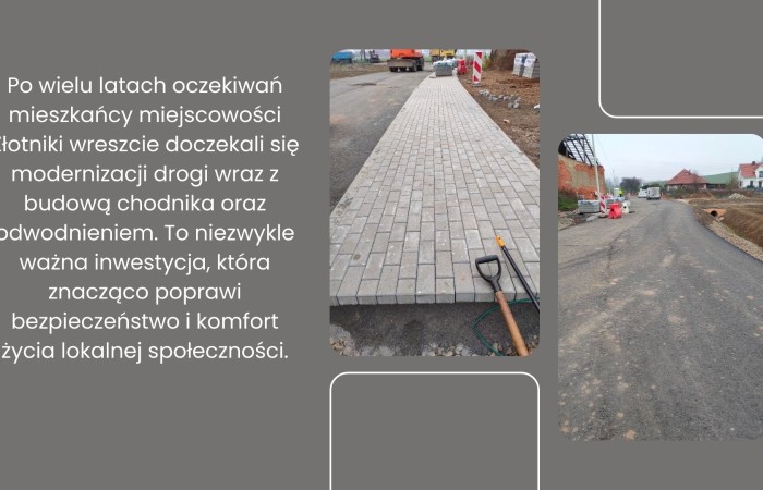 Po wielu latach oczekiwań mieszkańcy miejscowości Złotniki wreszcie doczekali się modernizacji drogi wraz z budową chodnika oraz odwodnieniem. To niezwykle ważna inwestycja, która znacząco poprawi bezpieczeństwo i komfort życia lokalnej społeczności.