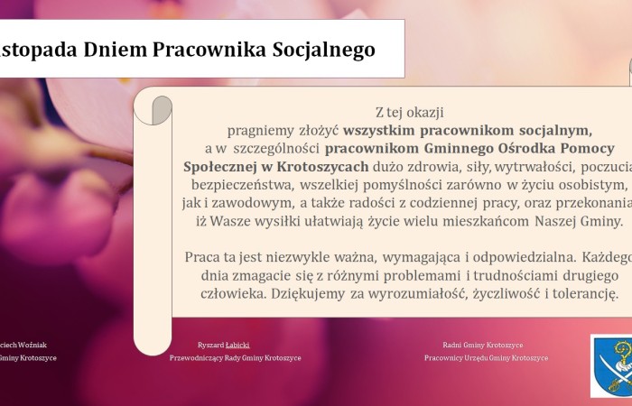 Z tej okazji pragniemy złożyć wszystkim pracownikom socjalnym, a w szczególności pracownikom Gminnego Ośrodka Pomocy Społecznej w Krotoszycach dużo zdrowia, siły, wytrwałości, poczucia bezpieczeństwa, wszelkiej pomyślności zarówno w życiu osobistym,jak i zawodowym, a także radości z codziennej pracy, oraz przekonania, iż Wasze wysiłki ułatwiają życie wielu mieszkańcom Naszej Gminy.