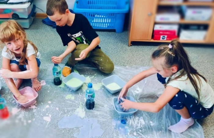 Dzieci z oddziału przedszkolnego w grupie 5 i 6 latków z SP Krotoszyce uczestniczą w zajęciach z scenoplastyki, których celem jest rozwój kreatywności i twórczego myślenia u dzieci. W czasie zajęć dzieci poznają różne kolory, struktury oraz konsystencje. Zabawy sensoplastyczne oddziaływają na wszystkie zmysły.