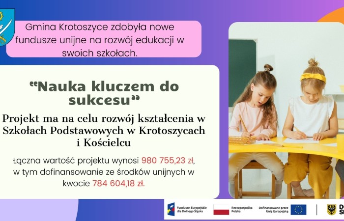 Projekt pn. „Nauka kluczem do sukcesu – zajęcia dla uczniów i doposażenie Szkół Podstawowych w Gminie Krotoszyce” zakłada rozwój kształcenia w SP w Krotoszycach i SP w Kościelcu poprzez: